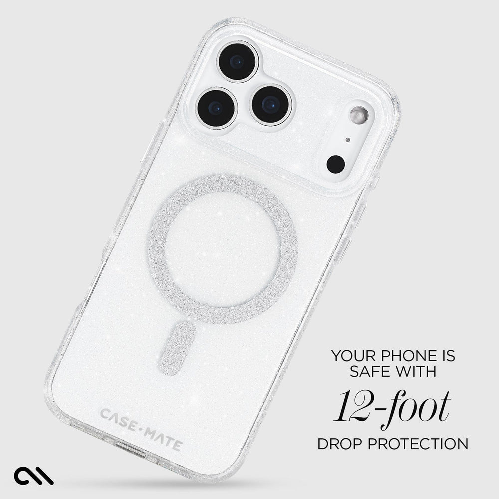 Let your phone shine with the Sheer Twinkle Silver MagSafe Phone Case for the iPhone 17 Pro Max! The silver sparkles in this case catch the light for a perfect shimmering effect, while strong built-in magnets allow for easy MagSafe accessorizing and charging. We know how much you love your phone, so feel confident knowing it’s safe with 12-foot drop protection.