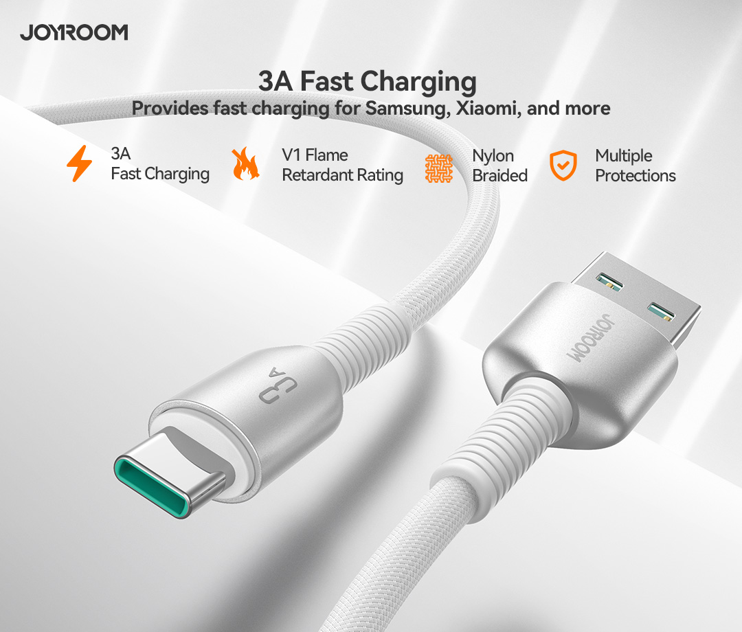 Power up your devices efficiently with the Joyroom S-A51 Cutting-Edge Series USB-A to USB-C cable. Featuring 48-strand high-density nylon braiding, a spring-style SR joint, and a thicker tinned copper core, it delivers 3A fast charging with superior durability. Withstanding 30,000+ bends, it’s ideal for daily charging and data sync. The sleek metallic finish and 1.2m length ensure convenience, strength, and style for any USB-C device.