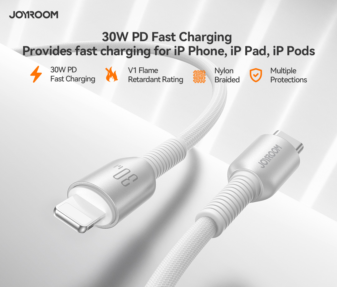 Charge your iPhone faster with the Joyroom S-A51 USB-C to Lightning cable, featuring 3A fast charging, a 48-strand nylon braided exterior, and a durable spring-style SR design. Built with a tinned copper core for low resistance and quick power delivery, it withstands over 30,000 bends for long-lasting use. The sleek space gray metallic finish and 1.2m length make it ideal for daily fast charging and data syncing with all Lightning-compatible Apple devices.