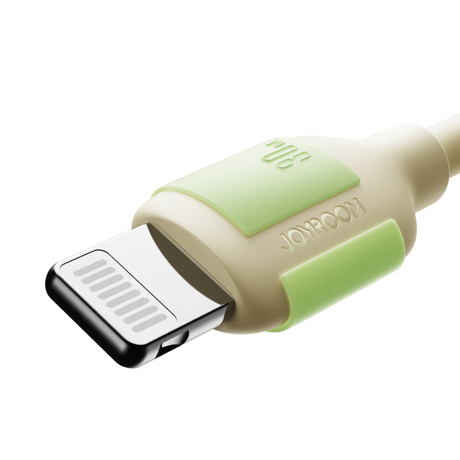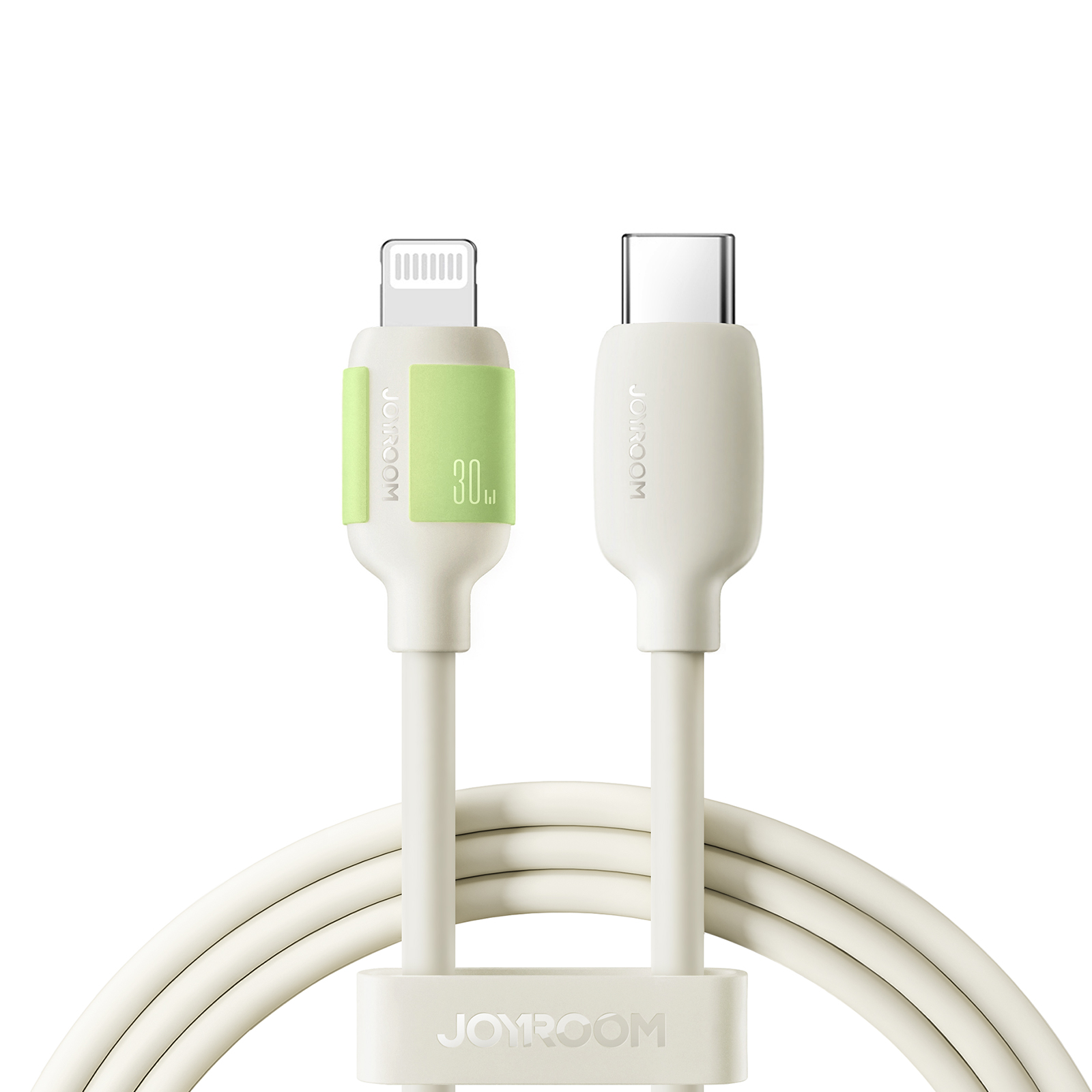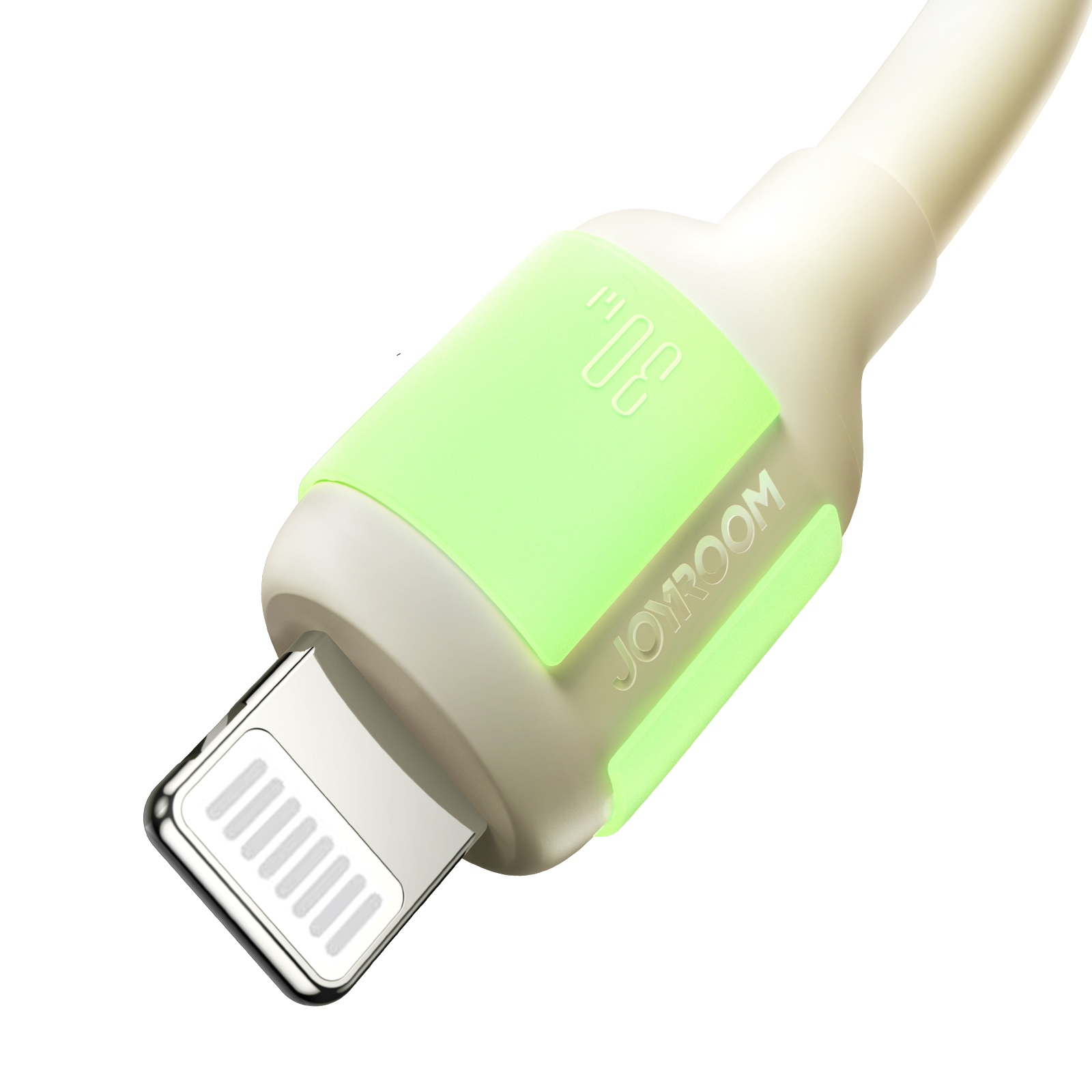 Charge your iPhone quickly and safely with the Joyroom S-A53 Type-C to Lightning cable, supporting up to 30W PD fast charging. Made with real liquid silicone, it’s super soft, flexible, and tangle-free. The glow-in-the-dark fluorescent connector makes it easy to find at night, while the anti-oxidation terminal, fire-retardant build, and 10,000+ bend lifespan ensure durability. Stylish in beige, this cable combines performance, comfort, and nighttime convenience.