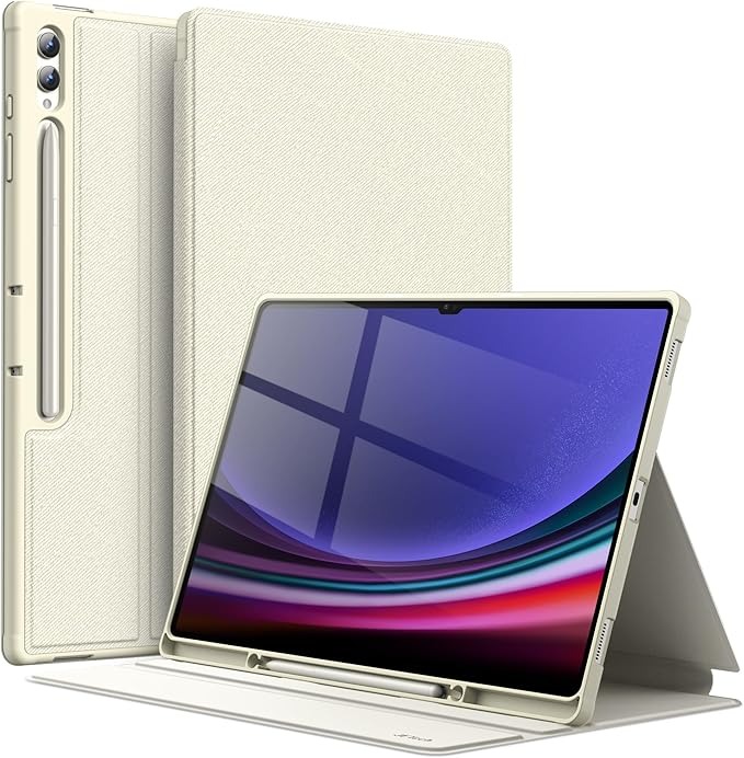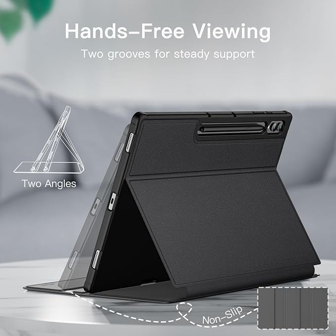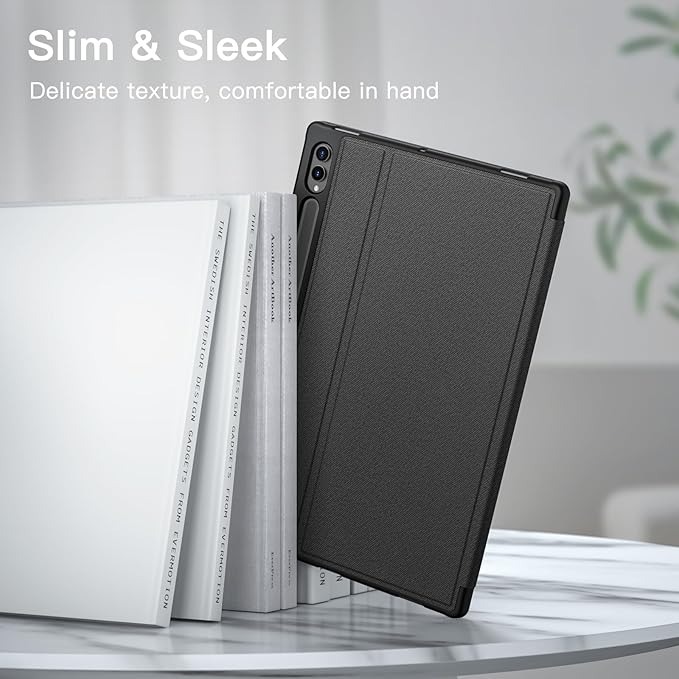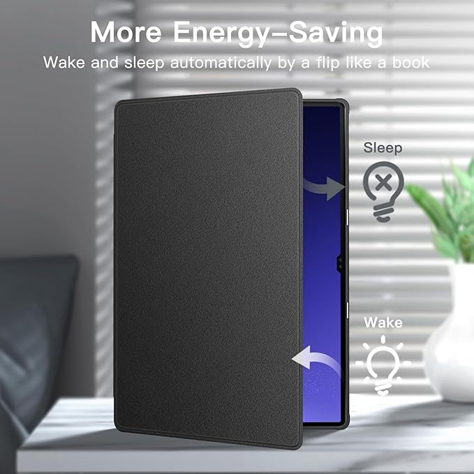 Designed specifically for the Samsung Galaxy Tab S10 Ultra and Tab S9 Ultra 14.6-inch models, this case offers enhanced drop protection with a premium PU leather exterior and flexible TPU interior, providing a slim yet shockproof design that adds minimal bulk while ensuring a comfortable, secure grip. It features a built-in pen slot for your S Pen (not included) with support for magnetic wireless charging on the back, allowing easy access and storage. The front cover includes two anti-slip grooves that enable multiple standing positions for comfortable viewing, while wider cutouts provide easy access to the camera, speakers, buttons, and other features. Additionally, the strong built-in magnet supports automatic wake/sleep functionality, making opening and closing the case effortless and secure.